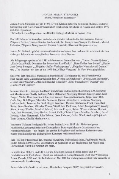 Janusz M. Stefański należy do czołówki muzyków nowoczesnego jazzu i już we wczesnych latach siedemdziesiątych wyrobił sobie renomę na europejskiej scenie jazzowej.